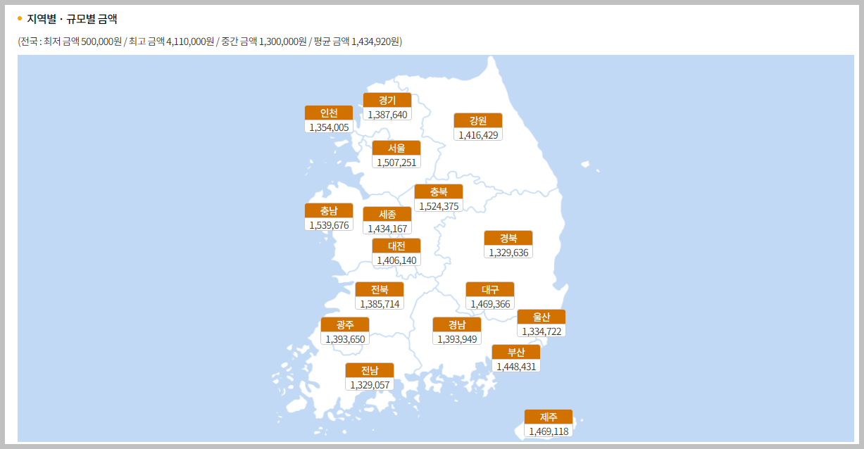 아래와 같이 지역별 규모별 금액 또한 확인해볼 수 있습니다. 2022년 8월 20일 현재 전국 최저금액은 500,000원, 중간 금액은 1,300,000원, 평균금액은 1,434,920원인 것을 확인해볼 수 있습니다.